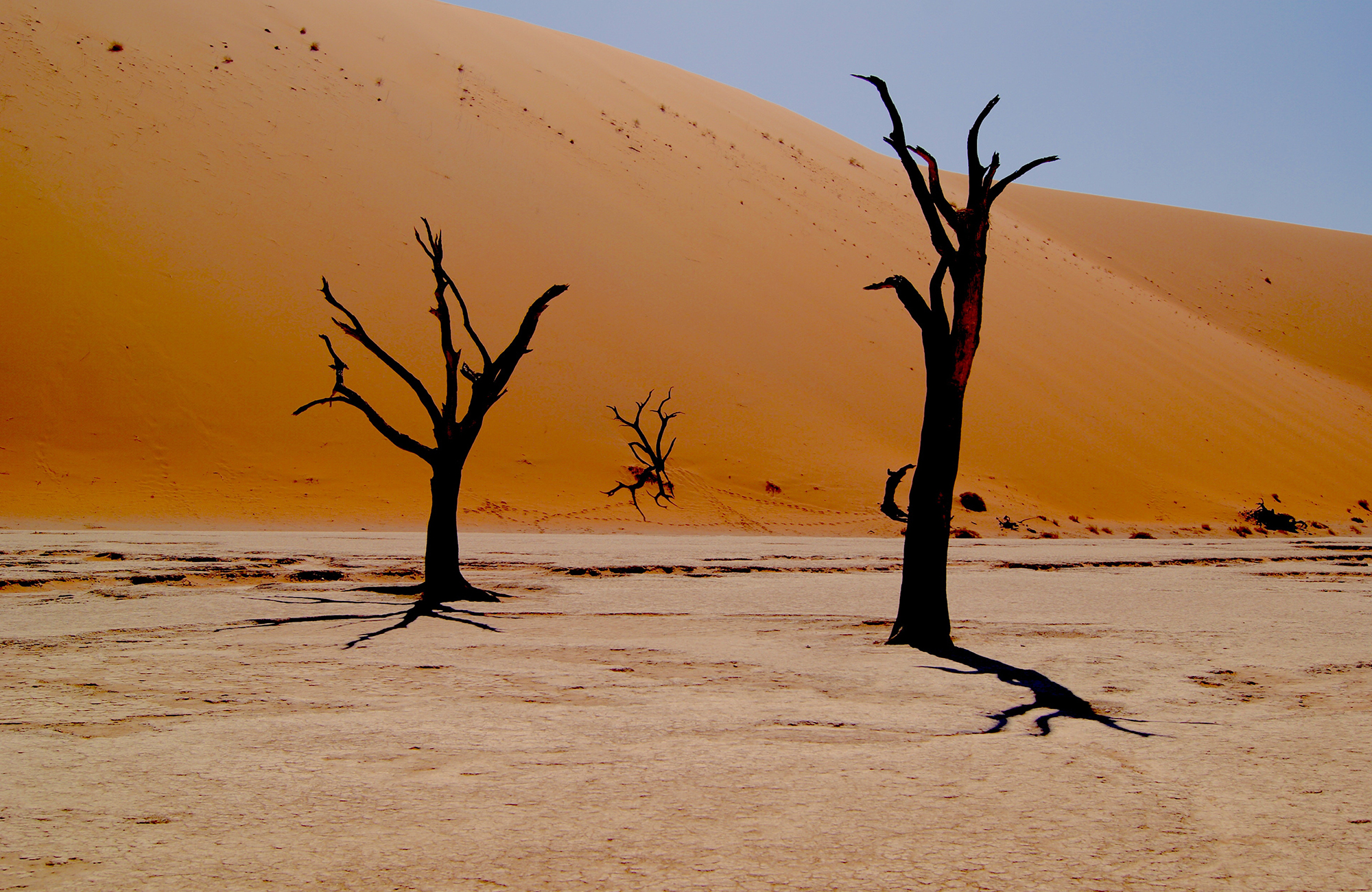 Dead Vlei on valkea savitasanko, jota ympäröivät korkeat hiekkadyynit. Pystyyn kuivuneet puut osoittavat, että alueella oli joskus vettä – nyt metsä on autioitunut ja elämän sijaan tilalla on paljon elotonta. Puut ovat arvioiden mukaan ainakin 900 vuotta vanhoja, joten ihan eilen ei metsä Namibiassa kukoistanut vihreänä. Kuivuus on alueen suurin (ja näitä kuvia katsoessa itsestään selvä) ongelma ja porottava aurinko on muuttanut puiden rungot mustiksi. Tämä on todellakin ällistyttävä näky ja osoitus luonnon monimuotoisuudesta ja muuntautumiskyvystä.