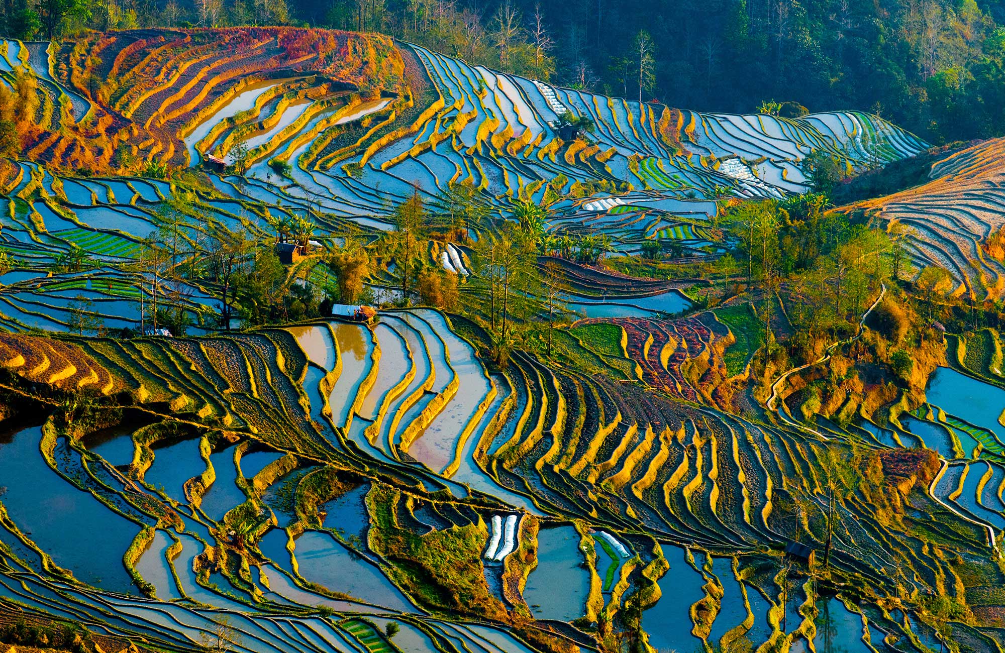 Yli 10 000 hehtaaria porrastettuja riisipeltoja – tämä on nähtävä! Yuanyangin riispellot Kiinassa nousevat Ailao-vuorilla jopa 3 000 metrin korkeuteen merenpinnan yläpuolelle ja ulottuvat usean kylän alueelle.