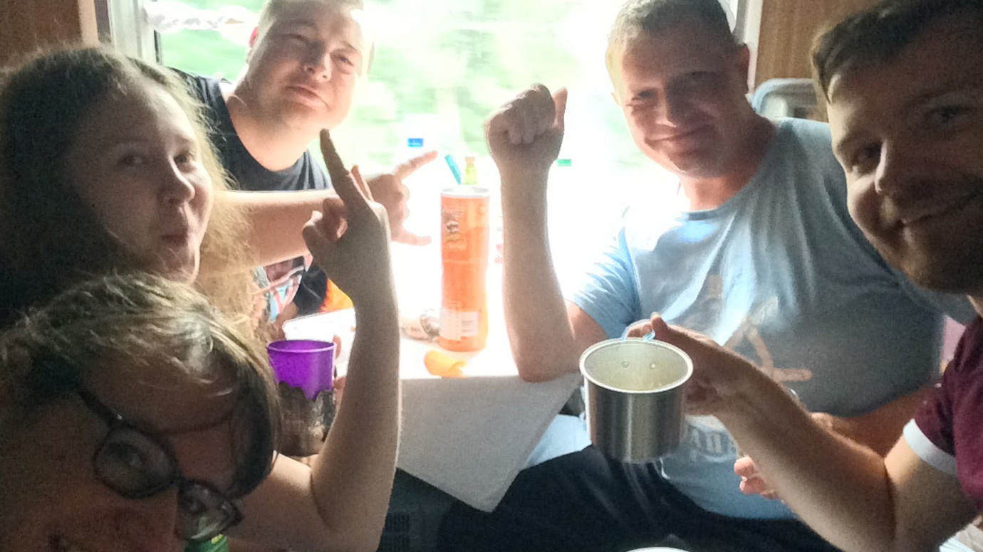 Pullo tuli tarpeeseen, kun naapurihytin matkaajat kutsuivat meidät lasillisille. Siitäkin huolimatta, ettei meillä ollut yhteistä kieltä, ilta oli mitä ikimuistoisin. Kommunikointi käännös-appien välityksellä toi keskusteluihin mielenkiintoista lisäväriä, ja alle parissa tunnissa ensimmäinen vodkapullo oli jo tyhjä. Onneksi naapurimme olivat niin ikään hyvin varustautuneita pitkään matkaan ja ilta jatkui iloisissa merkeissä.